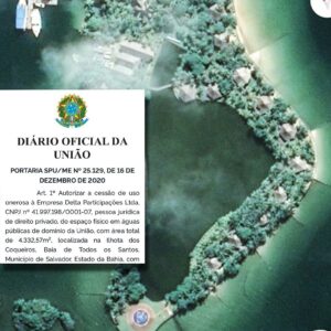 Saiu no Diário Oficial da União a concessão de 4.332,57m² da Ilhota dos Coqueiros, na Baía de Todos os Santos, para construção de uma marinha. Pelas informações do documento, não sabemos se houve estudo apurado de viabilidade ambiental. A área foi concedida à empresa Delta Participações, por R$ 717,98, durante os próximos 20 anos.