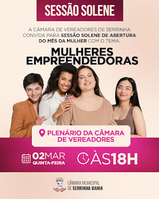 A Câmara de Vereadores de Serrinha realizará nesta quinta-feira (02), às 18 horas, uma sessão solene de abertura do mês da mulher com o tema: Mulheres empreendedoras, participe!