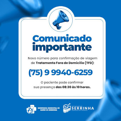 Novo número para confirmação de viagem de Tratamento Fora de Domicílio (TFD): (75) 9 9940-6259. O paciente pode confirmar sua presença das 08:30 às 10 horas.