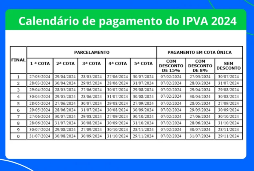 Caso não possa pagar até o dia 7 de fevereiro, o contribuinte tem ainda a opção de quitar o imposto com 8% de desconto. Para isso, é necessário que faça a quitação, à vista, no dia do vencimento da primeira parcela do parcelamento previsto para o seu veículo, fixada de acordo com o calendário anual, conforme o número final da placa.