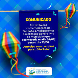 Em razão das comemorações de São João, a prefeitura de Serrinha antecipará a feira livre do município, que aconteceria no sábado (24), para a sexta-feira (23).