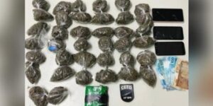 Com eles foram encontrados 38 pacotes e 1/2 tablete de uma erva esverdeada análoga à maconha, R$450,00 em espécie, € 10,00 em espécie, um smartphone xiaomi azul, e duas sucatas de smartphone quebrados.