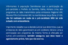 Informamos à população Serrinhense que a participação do pré-candidato a Prefeito de Serrinha, Bahia, Adriano Lima, aos programas de rádio transmitidos pelas emissoras Regional AM, Morena FM e Continental AM, na manhã...