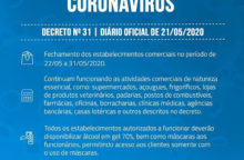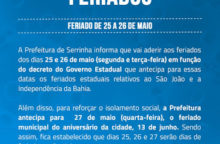 A Prefeitura de Serrinha anunciou ontem, através do decreto abaixo, novas medidas de combate à COVID-19 DECRETO Nº 31 | DIÁRIO OFICIAL DE 21/05/2020 – Fechamento dos estabelecimentos comerciais no período de...
