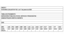 A tabela de pagamento em 2020 dos servidores ativos, aposentados e pensionistas das administrações Direta e Indireta, fixando as datas de desembolso dos vencimentos mês a mês, foi publicada na edição de...