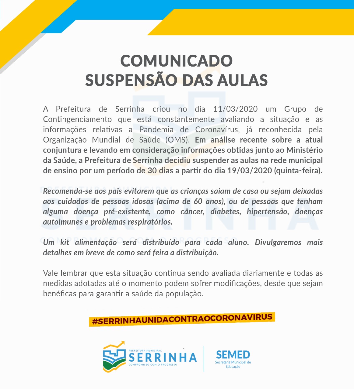 A Prefeitura de Serrinha criou no dia 11/03/2020 um Grupo de Contingenciamento que está constantemente avaliando a situação e as informações relativas a Pandemia de Coronavírus, já reconhecida pela Organização Mundial de Saúde (OMS). Em análise recente sobre a atual conjuntura e levando em consideração informações obtidas junto ao Ministério da Saúde, a Prefeitura de Serrinha decidiu suspender as aulas na rede municipal de ensino por um período de 30 dias a partir do dia 19/03/2020 (quinta-feira).