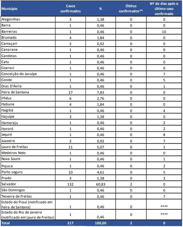 A Secretaria da Saúde do Estado (Sesab) ressalta que os números são dinâmicos e na medida em que as investigações clínicas e epidemiológicas avançam, os casos são reavaliados, sendo passíveis de reenquadramento na sua classificação. Outras informações estão disponíveis no