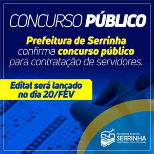 Prefeitura de Serrinha abre Concurso Público para o preenchimento de 271 vagas. Boa oportunidade para quem está em busca de estabilidade profissional. O edital com todas as informações será publicado no Diário Oficial do Município nesta quinta-feira, 20.02.