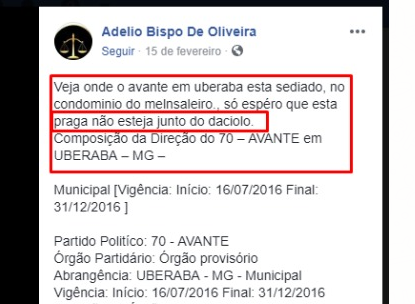 Uma postagem de fevereiro no facebook de Adélio Bispo Oliveira, autor da facada em um candidato a presidência da república, mostra que ele nutre simpatia por outro concorrente ao Palácio do Planalto. Na postagem ele faz uma denúncia sobre a sede do partido Patriota na cidade mineira de Uberaba, informando que é no condomínio “do mensaleiro” e torce para que essa “praga” não esteja junto à Daciolo.