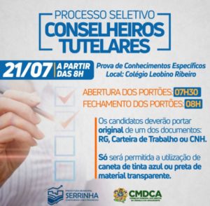 Neste domingo, 21, acontecerá a etapa de avaliação (prova eliminatória) do processo de escolha dos futuros Conselheiros Tutelares. A prova de conhecimentos específicos será aplicada no colégio Leobino Ribeiro com abertura dos portões às 7h30 e fechamento às 8h. Os candidatos deverão comparecer ao local munidos com o original de um desses documentos: RG (Identidade), Carteira de Trabalho ou Carteira de Habilitação. Só será permitida a utilização de caneta de tinta azul ou preta e de material transparente.