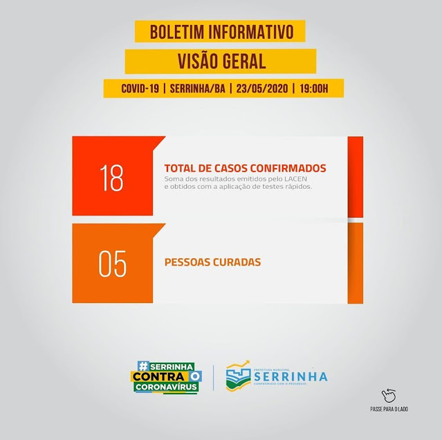 A junção de todos os testes mostra que Serrinha registra um total de 18 casos de Coronavírus, com cinco pessoas curadas.