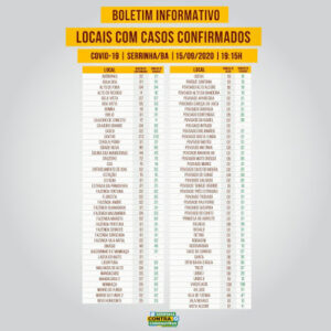 A Prefeitura de Serrinha informa que nesta terça-feira, 15/09, foram confirmados 13 novos casos de coronavírus. Sendo assim, a cidade atinge um total de 1.148 casos da Covid-19.