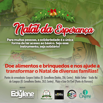 A vereadora de Serrinha e Presidenta da União dos Vereadores da Bahia, Edylene Ferreira, lançou a campanha Natal da Esperança que vai buscar doações de alimentos e brinquedos a serem distribuídos para a população mais carente do município. Edylene lembrou que “2020 foi um ano completamente atípico e que pegou a todos totalmente de surpresa, que veio pra mostrar a importância da união, do cuidado e nos permitiu um tempo a sós com nós mesmos. Um ano de reflexões e mudanças, que nos ensinou a nunca deixar para depois o eu te amo de hoje, o abraço, o carinho, o perdão, e principalmente a solidariedade.”