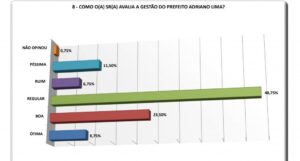 Candidato à reeleição, Adriano Lima tem a gestão avaliada como boa por 23,5% dos eleitores e ótima para 8,75%. Para a maior parte dos entrevistados, 48,75%, a administração dele é regular; 11,5% consideram a gestão péssima; e 6,75% consideram ruim. Apenas 0,75% dos eleitores optou por não responder.