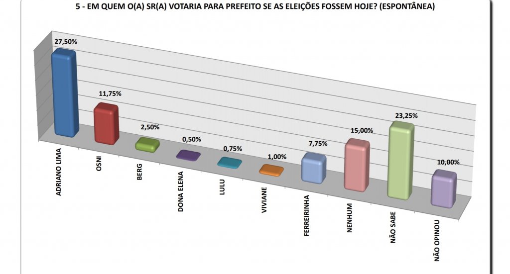 O prefeito também está na frente quando não são apresentados os nomes dos postulantes à prefeitura. Nessa situação, Adriano receberia o voto de 27,5% dos eleitores. Osni teria 11,75% e Berg 2,5%. Ferreirinha foi lembrado por 7,75% dos entrevistados. também foram citados, com até 1%, os nomes de Dona Elena (0,50%), Lulu (0,75%) e Viviane (1%). Não souberam ou não opinaram 24,25% e 15% indicaram não ter candidato no pleito de novembro.