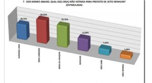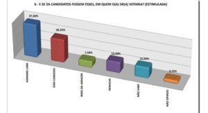 Já na rejeição, o deputado Osni Cardoso é quem aparece à frente, com 28,25%, seguido de perto por Berg da Aragon, com 25,75%. O atual gestor tem rejeição de 18,75%, não souberam ou não opinaram 12,5% e 15% indicaram que não rejeitam nenhum dos candidatos.
