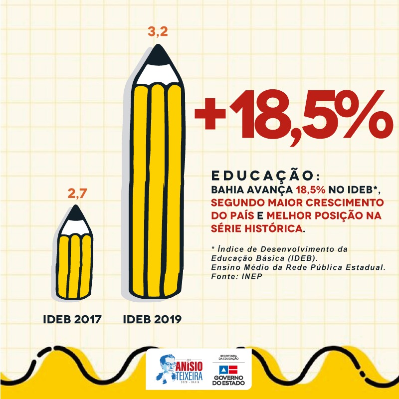 Em termos percentuais, a Bahia cresceu 18,5%, ficando abaixo apenas do Paraná, que foi de 18,9%. O IDEB também aponta crescimento nos ensinos Fundamental I e Fundamental II na rede estadual. A Bahia saiu de 4,9, em 2017, para 5,0 em 2019, no Fundamental I. Já no Fundamental II, a rede estadual da Bahia foi a que teve o maior crescimento (15,6%) entre todas as redes estaduais do país, passando de 3,2, em 2017, para 3,7, em 2019.