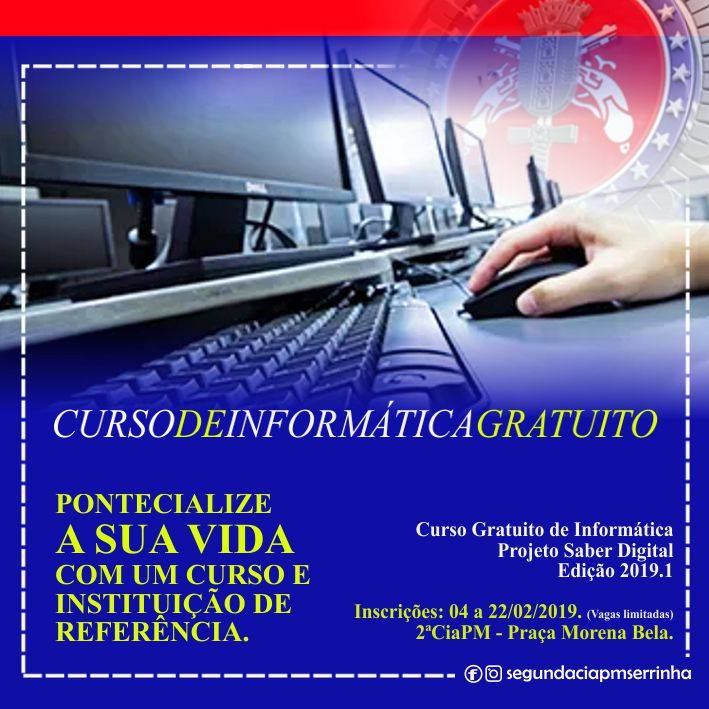Estão abertas as inscrições para Curso Gratuito de Informática do PROJETO SABER DIGITAL desenvolvido pela Polícia Militar. A expectativa é de capacitar mais de 100 cidadãos neste ano.