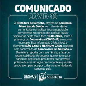 A Prefeitura de Serrinha divulgou comunicado para tranquilizar toda a população serrinhense em função das notícias falsas veiculadas nesta terça-feira, 10/03/2020, sobre a presença de casos de COVID19 na cidade.