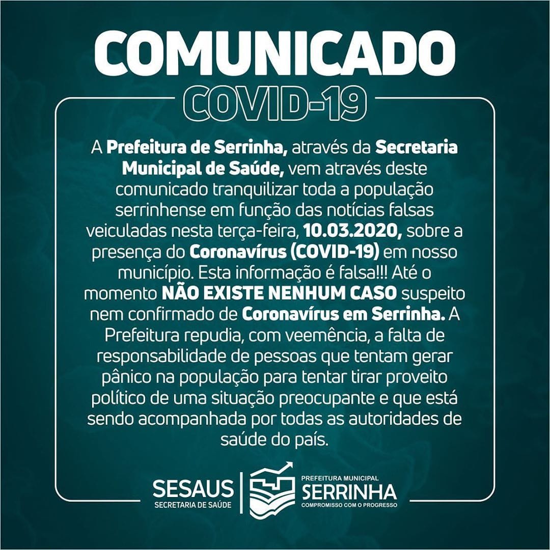 Firmam que “Até o momento NÃO EXISTE NENHUM CASO suspeito nem confirmado de Coranavírus em Serrinha.”