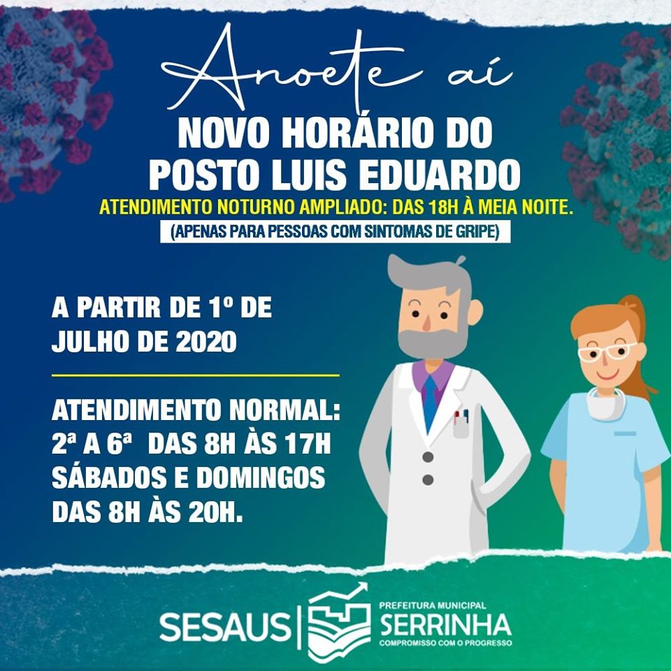 A Prefeitura Municipal de Serrinha informa que, por conta da pandemia do Coronavírus, a partir desta quarta-feira, 01 de julho, o posto Luis Eduardo vai ter o atendimento noturno ampliado.