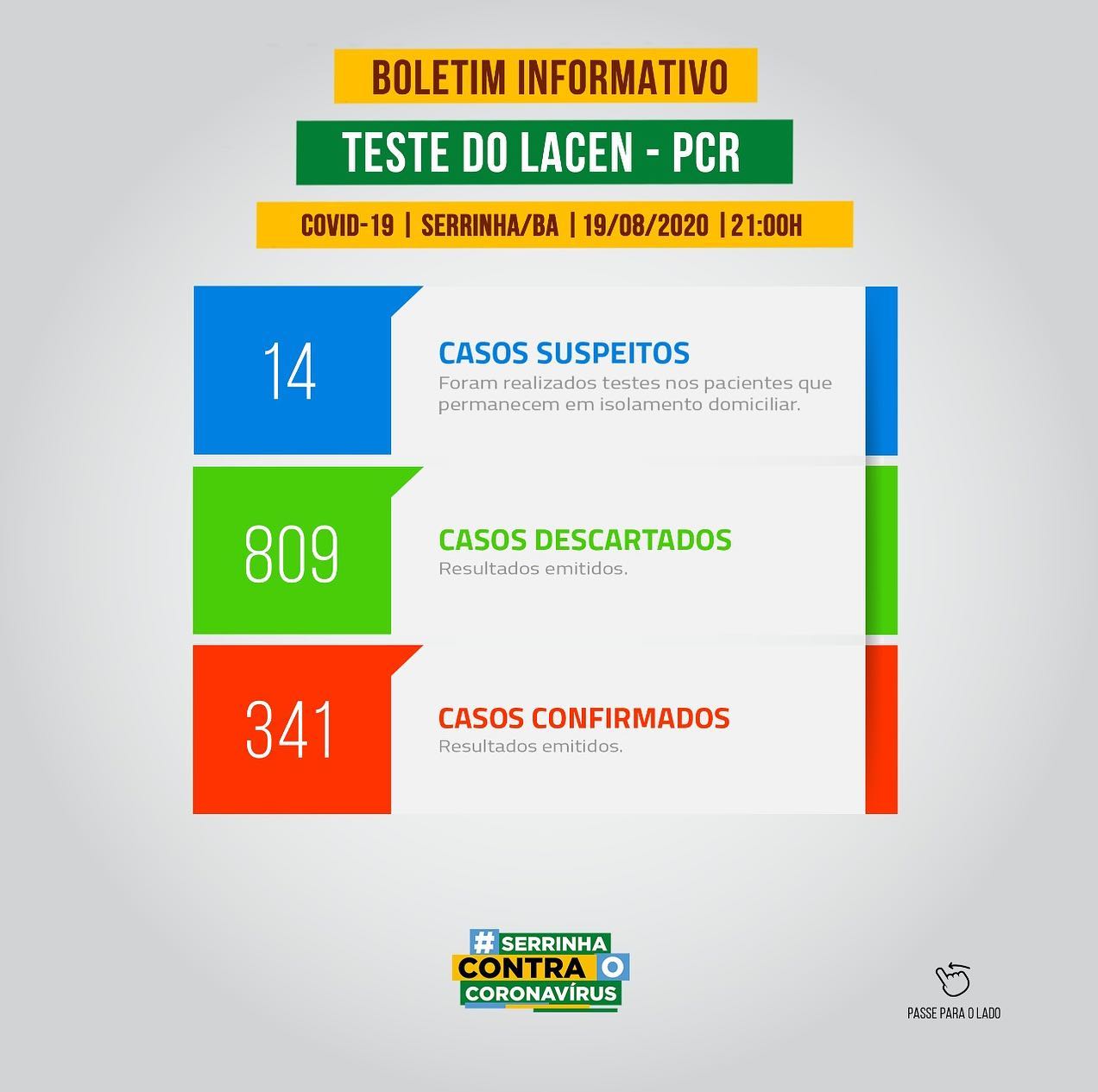 Hoje surgiram 14 novos casos suspeitos, 23 descartes e 2 casos positivos. Serrinha registra 23 casos suspeitos, e um total de 341 casos positivos.