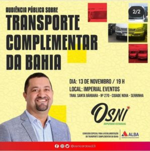 A Comissão Especial para Regulamentação do Transporte Complementar da Bahia da Assembleia Legislativa da Bahia (ALBA) realiza uma audiência pública nesta quarta-feira, 13, às 19 horas, no Imperial Eventos, em Serrinha, no intuito de ampliar as discussões e buscar soluções para os principais problemas enfrentados pelos transportistas baianos.