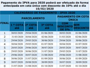 Para quem não puder aproveitar a redução de 10%, existe ainda a opção de pagar com 5% de abatimento. Nesse caso, é só quitar o valor integral no dia do vencimento da primeira cota, data que varia de acordo com o número final da placa do veículo.